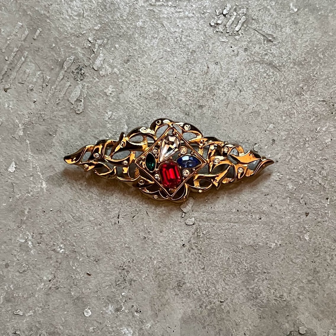 透かしのデザインとカラフルなガラスが目を引くブローチです。