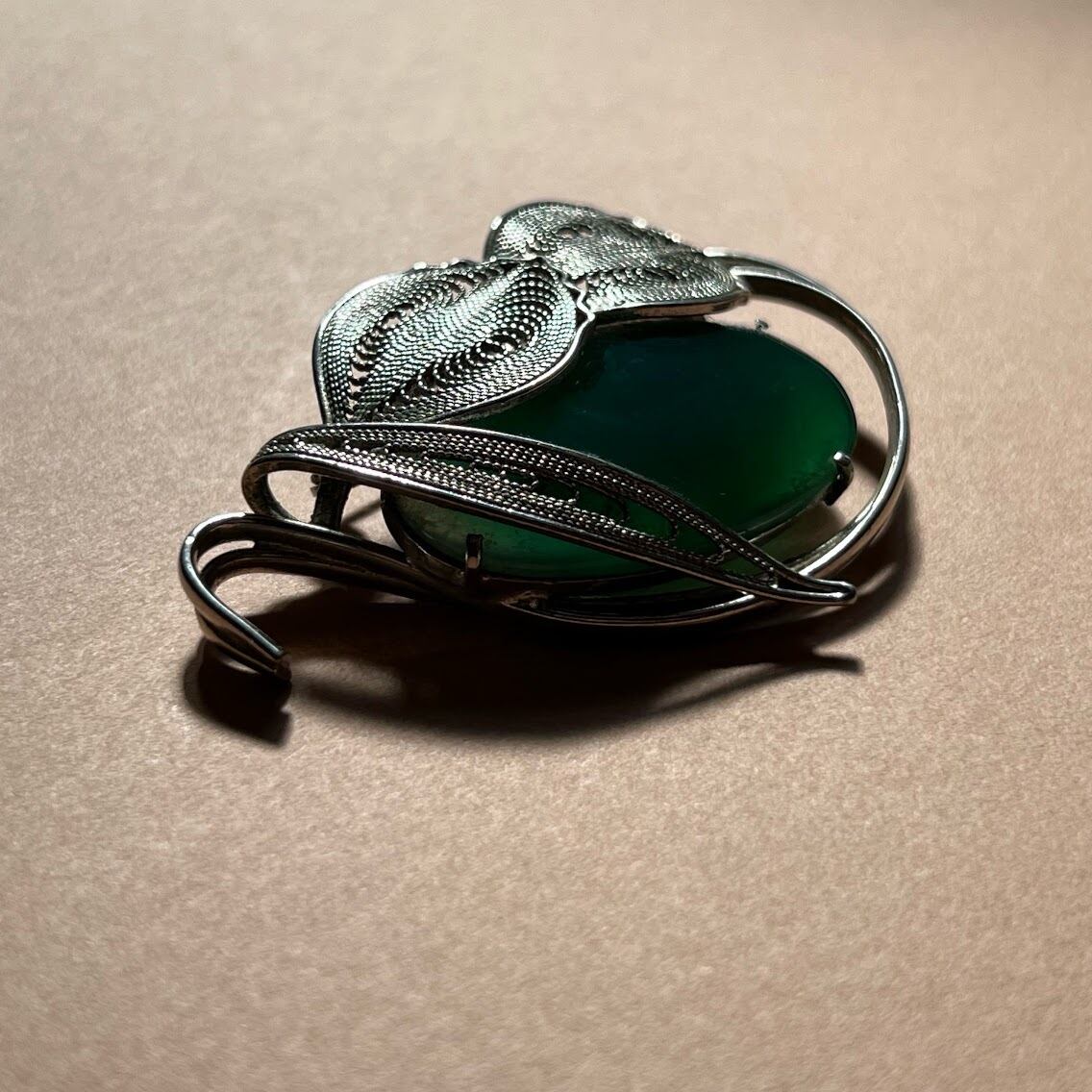 金属を糸状にして、特殊な技法で作られているリーフのデザインと、きれいな緑の石が素敵なブローチです。