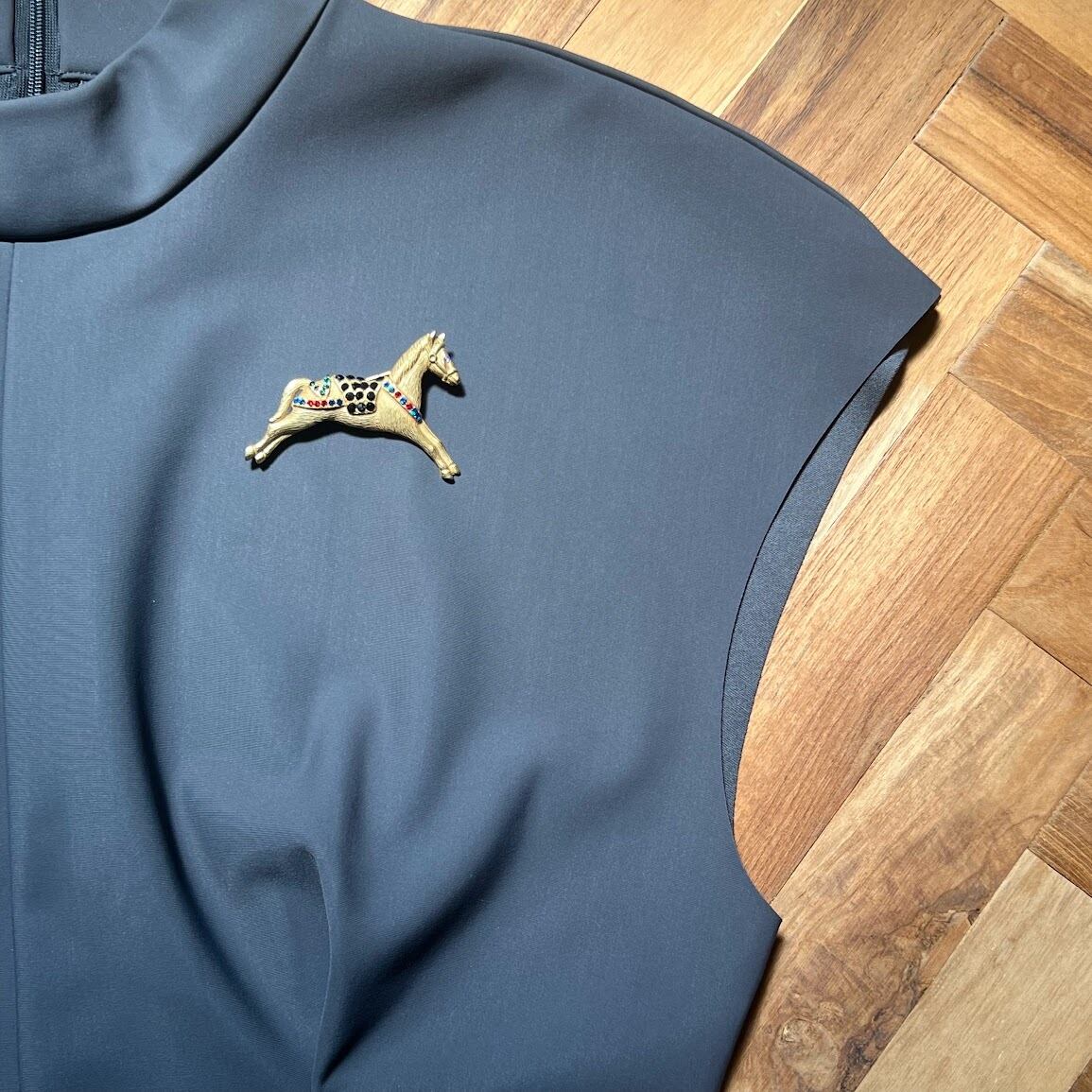 クラッシックなデザインの馬と、カラフルなガラスストーンが入ったブローチです。
