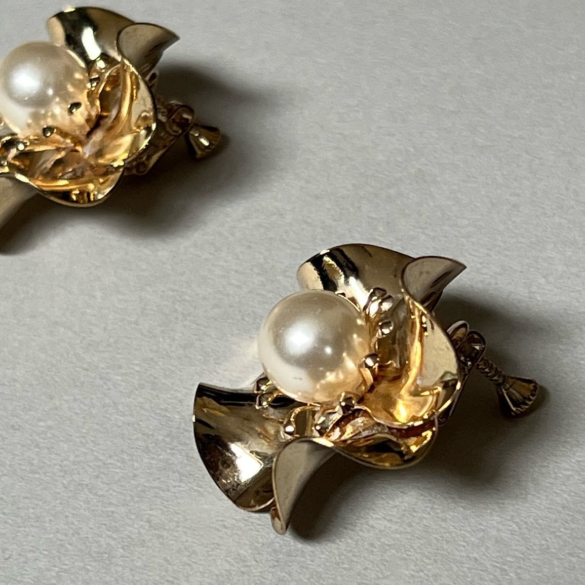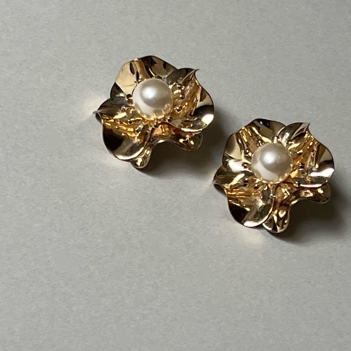 立体的に重ねられた花びらが、コーディネートのアクセントになってくれるイヤリングです。