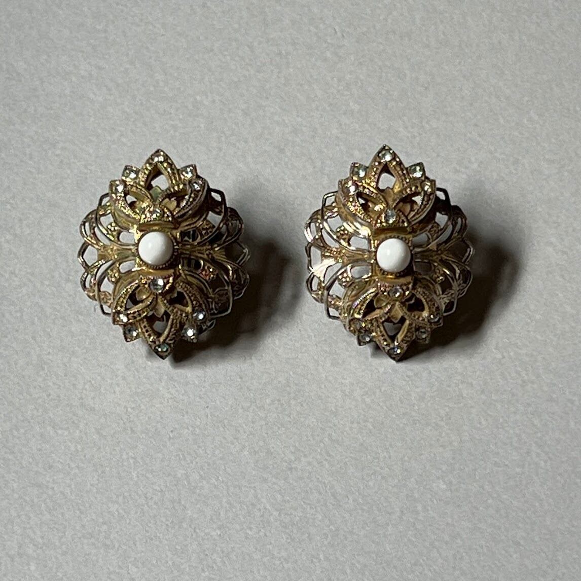 細かい装飾のデザインとメッキの色合いがクラシカルな雰囲気を出している魅力的なイヤリングです。