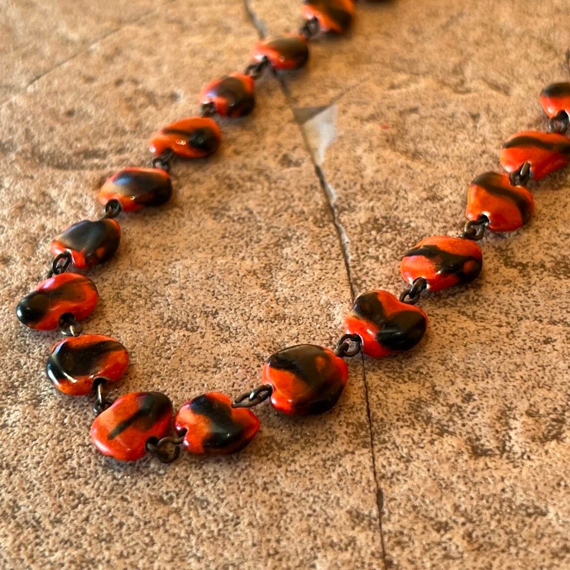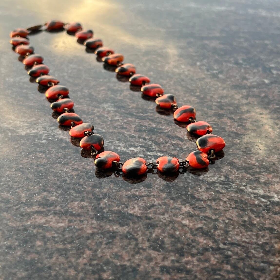 赤をベースに黒がポイントで入った、雰囲気あるデザインが魅力のネックレスです。