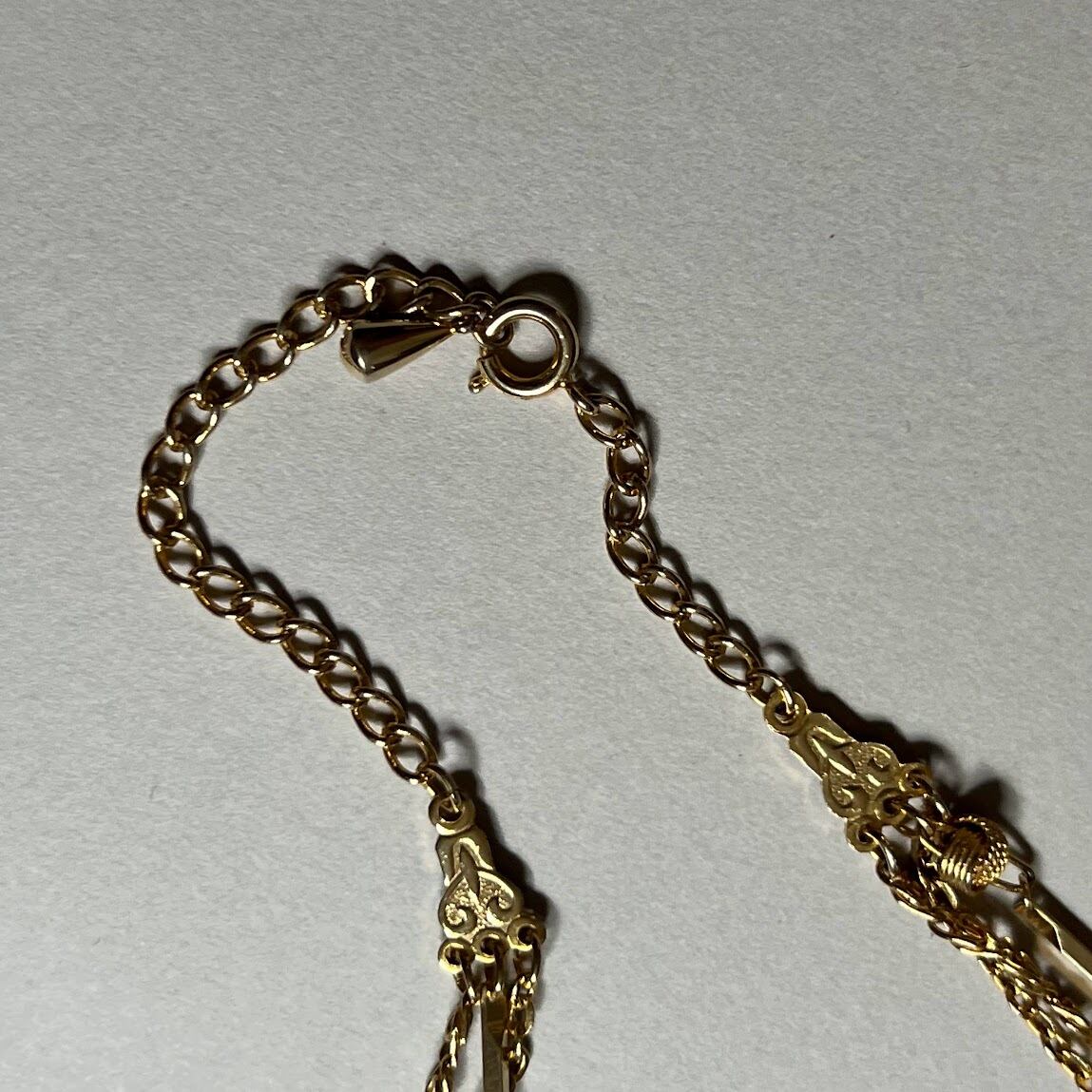 チェーンの間に結びのパーツがアクセントで入った、重ね付けしているように見える3連のネックレスです。
