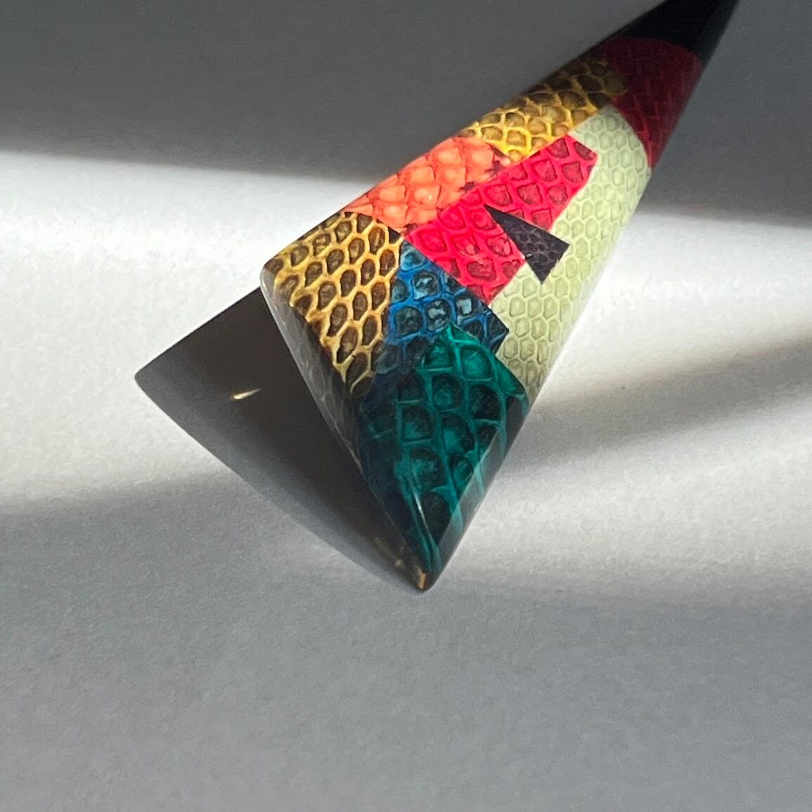 カラフルな色合いがコーディネートのポイントになる、蛇柄のブローチです。