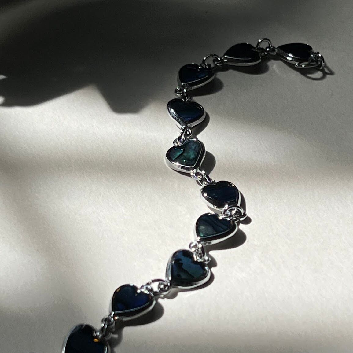 ハートの型のメタルにシェルが埋め込まれた、反射の色合いで輝きが変わるブレスレットです。