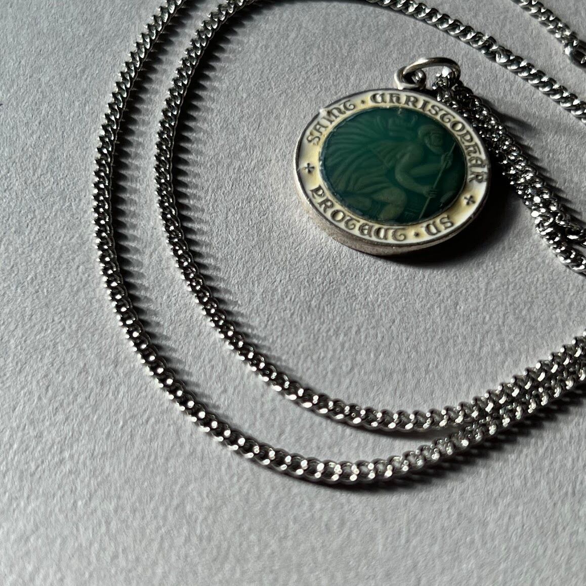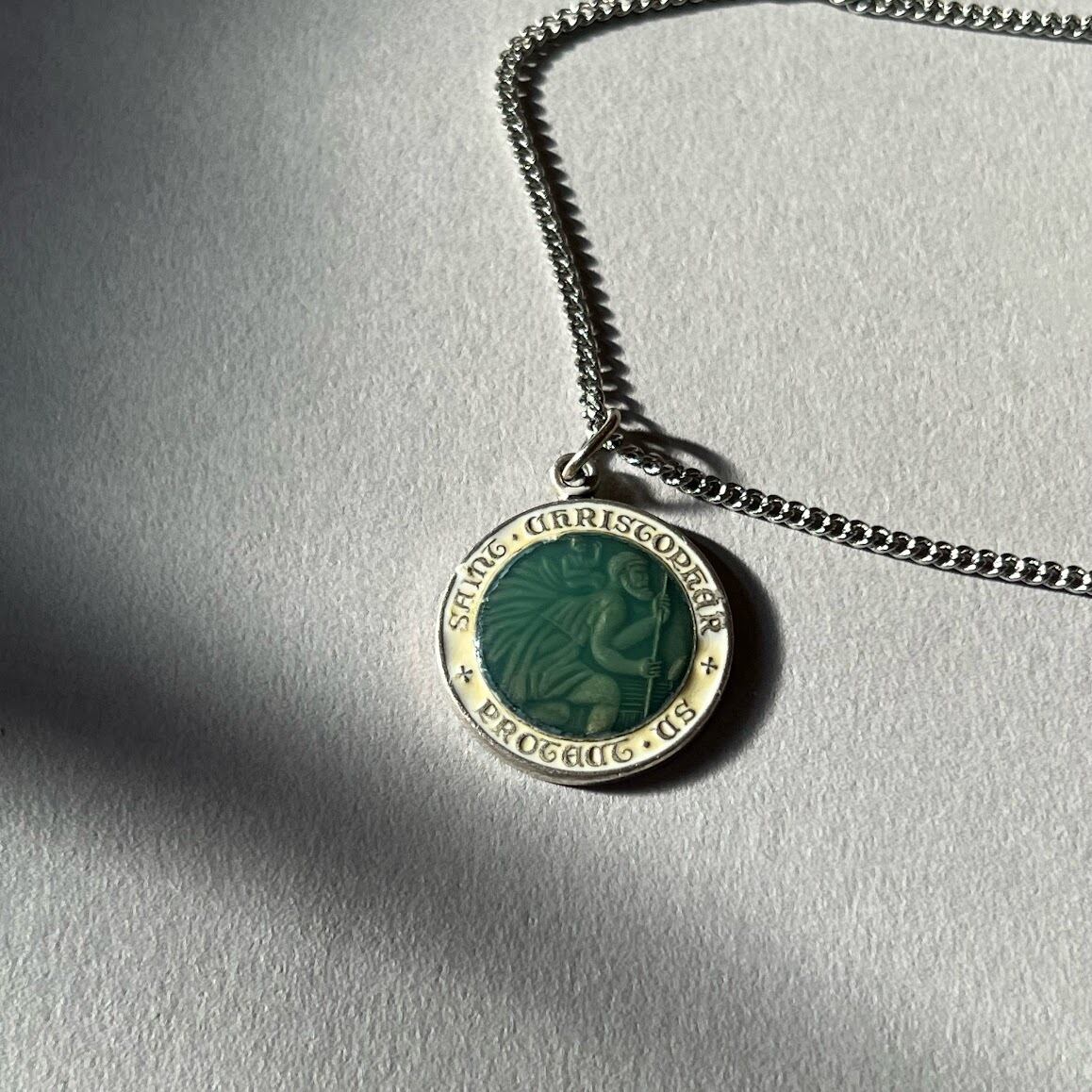 きれいなグリーンが映える、セントクリストファーモチーフのネックレスです。