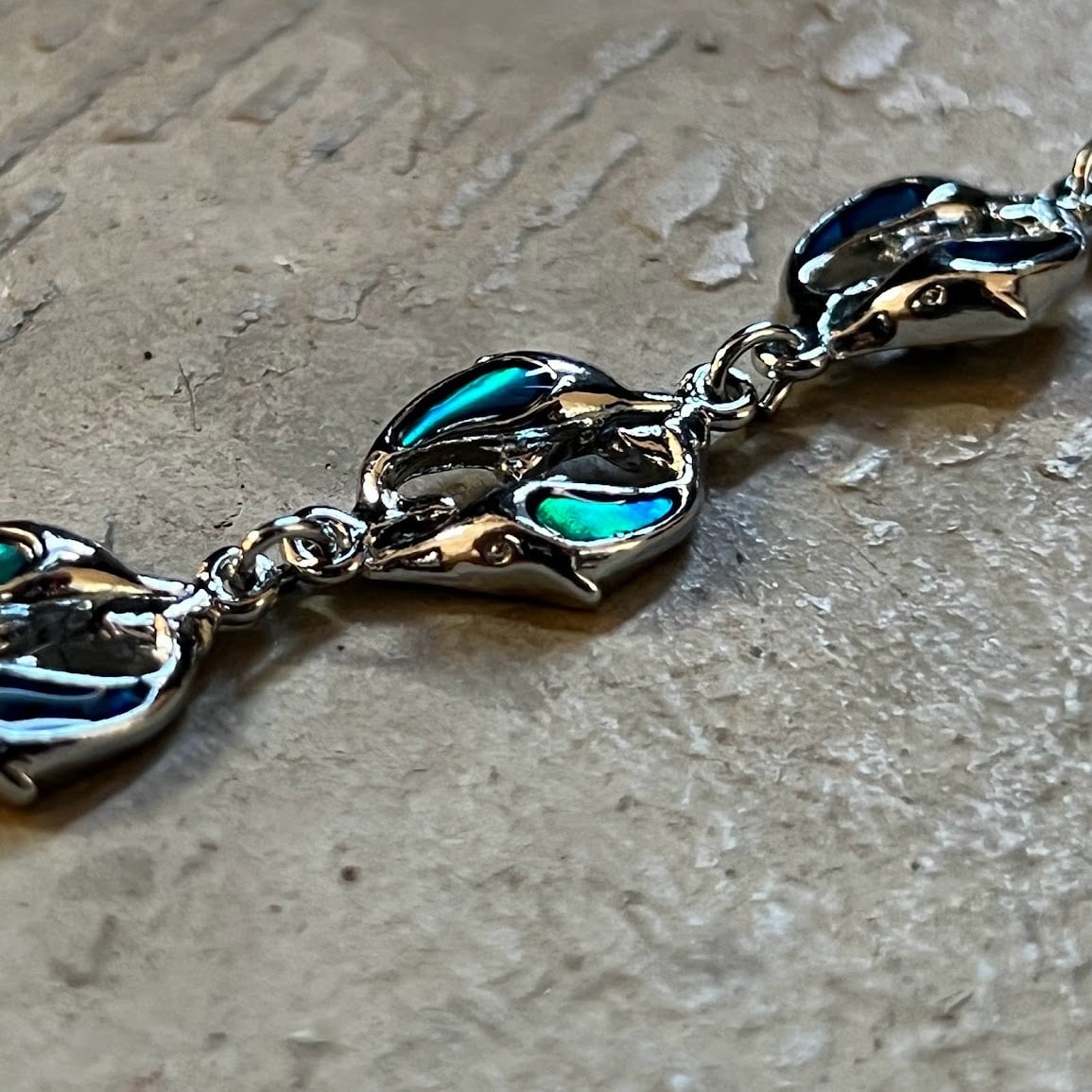 イルカの型に入ったシェルが、光にあたると上品に輝くのブレスレットです。