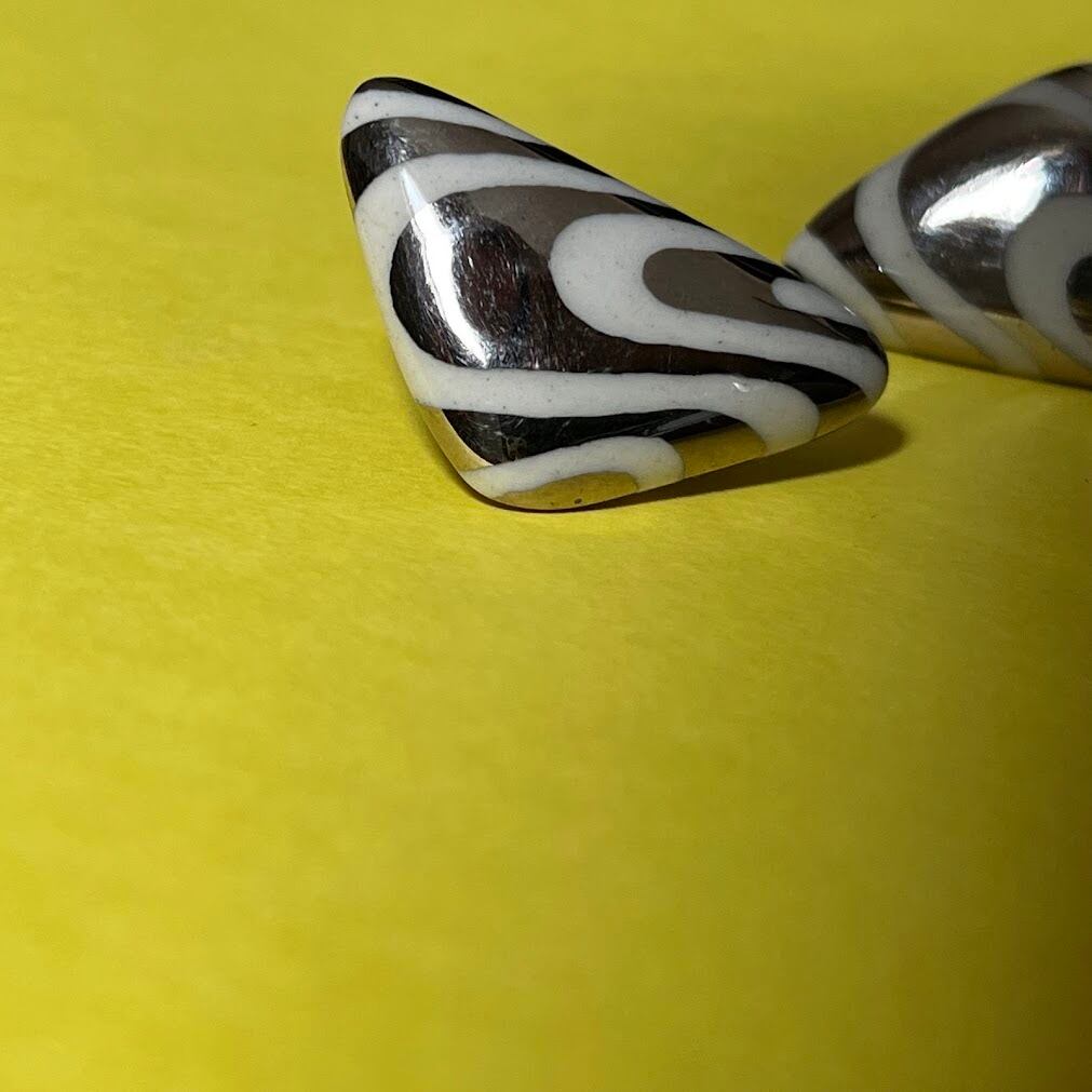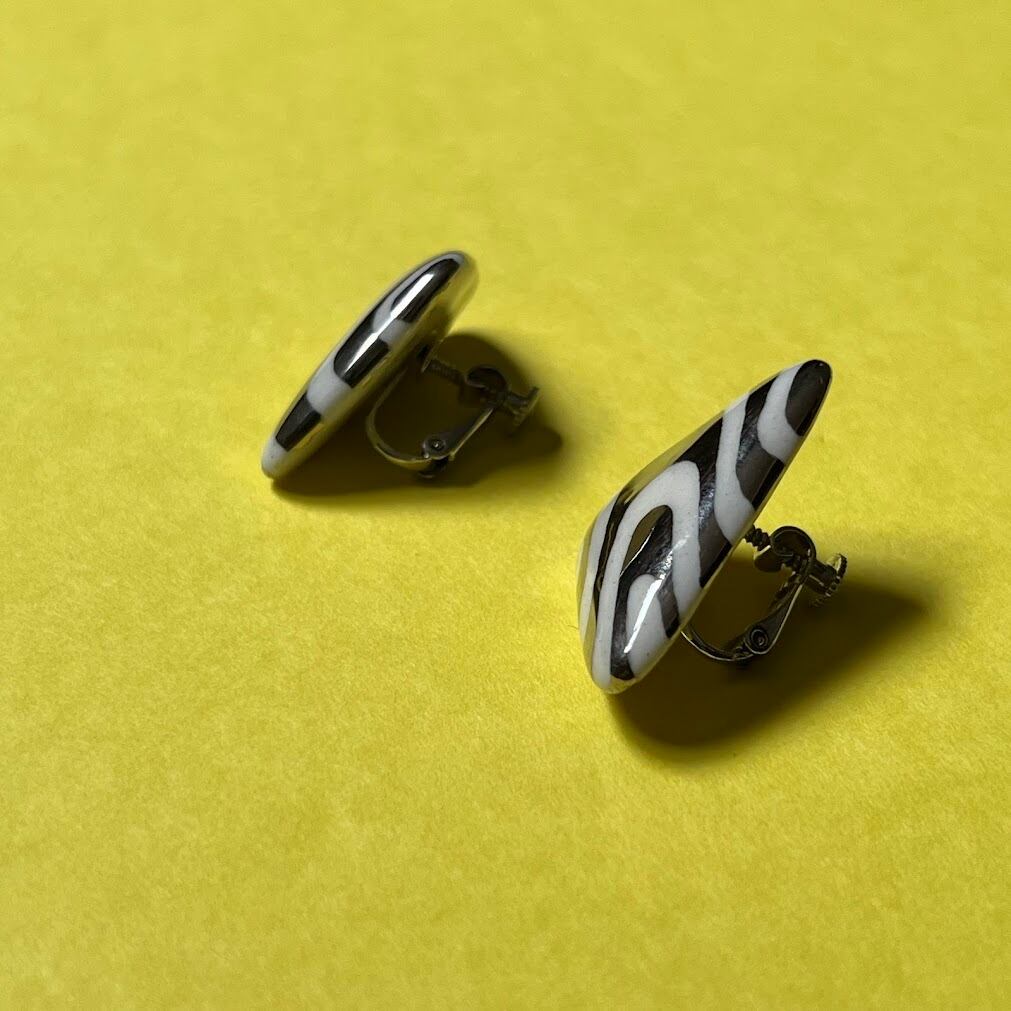 反射する土台にデザインされたパターンが、目を引くイヤリングです。