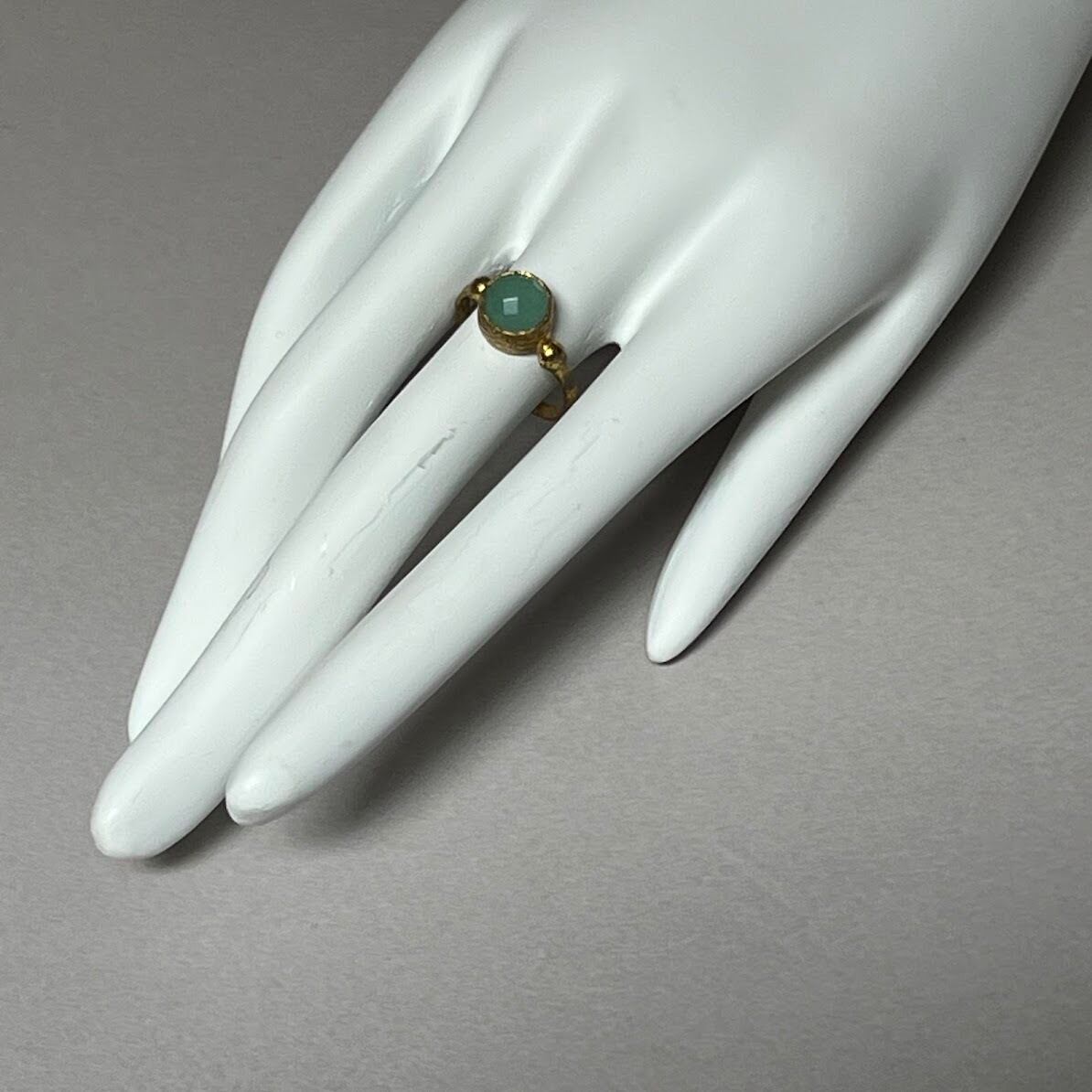 カットの入った石が、さりげばく輝く、ライトグリーンカラーのリングです。