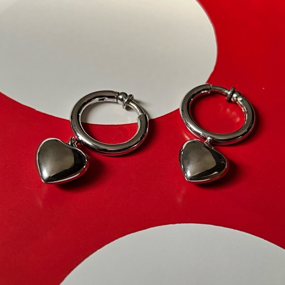 丸みがあるぷっくりとしたハートが揺れる、軽い着け心地のフープのイヤリングです。