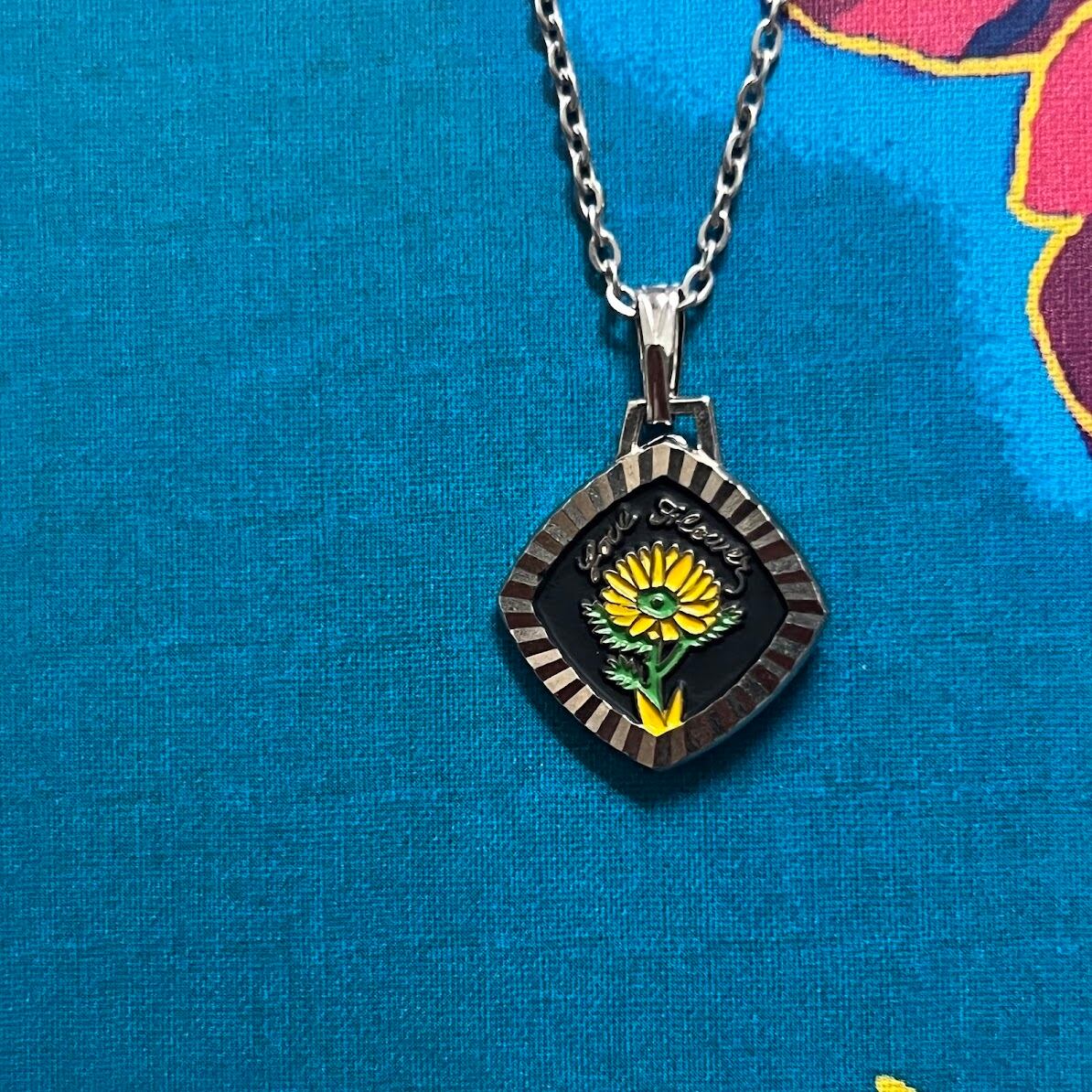 トップに描かれたフクジュソウのイラストと、裏側の花言葉が雰囲気あるネックレスです。