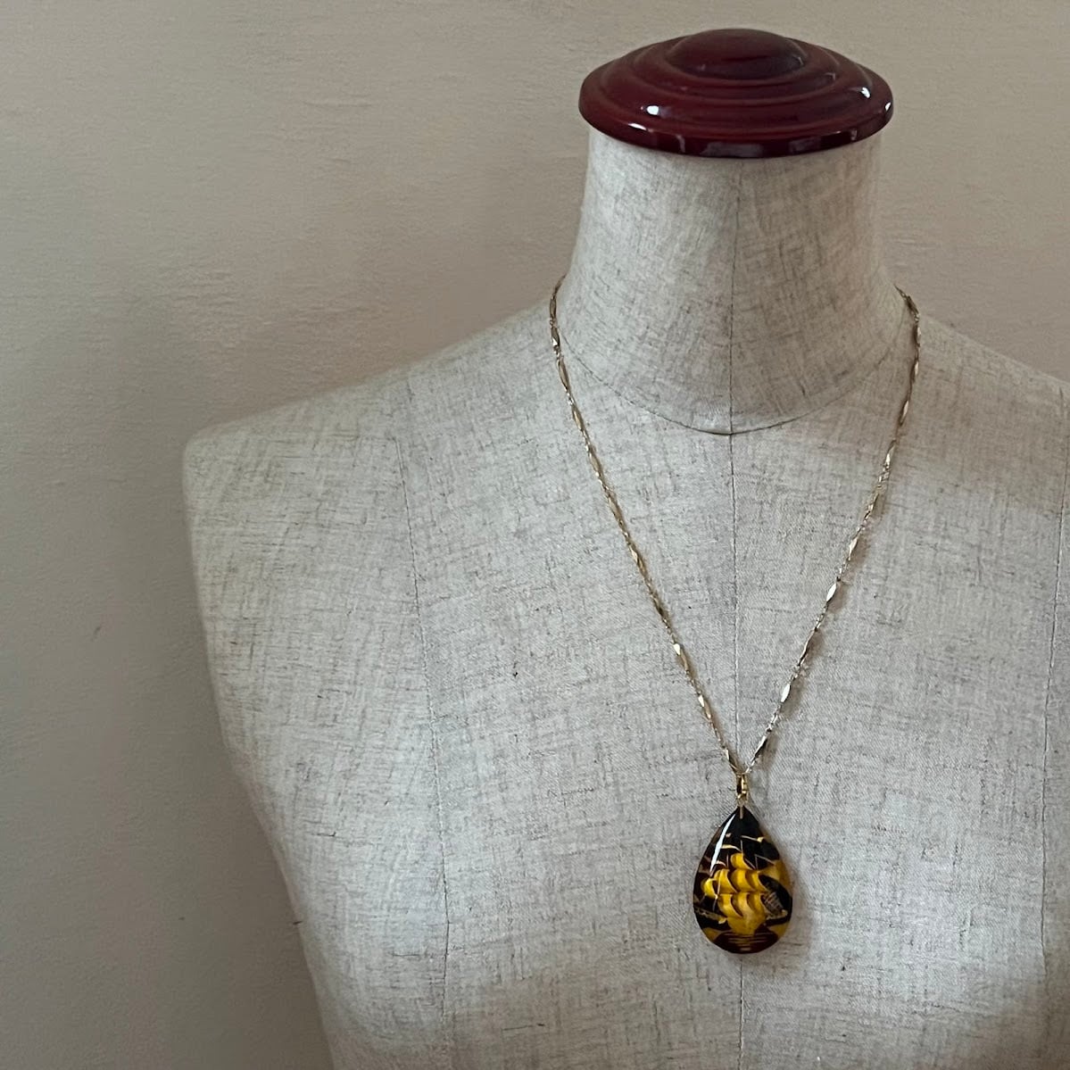 しずく型のパーツの裏側を彫り、表から見た時に船が立体的に見える、特殊な技術で作られたネックレスです。