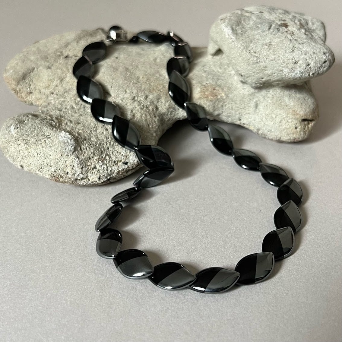 ブラックとグレイという艶感あるコンビメッキが、シックな雰囲気を出しているネックレスです。留め具にもデザインがあるため、バックスタイルも楽しめます。