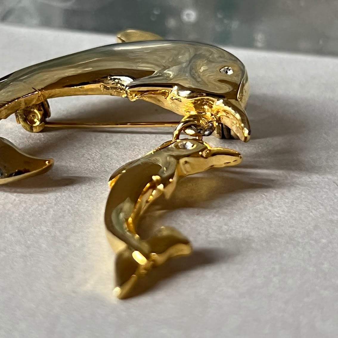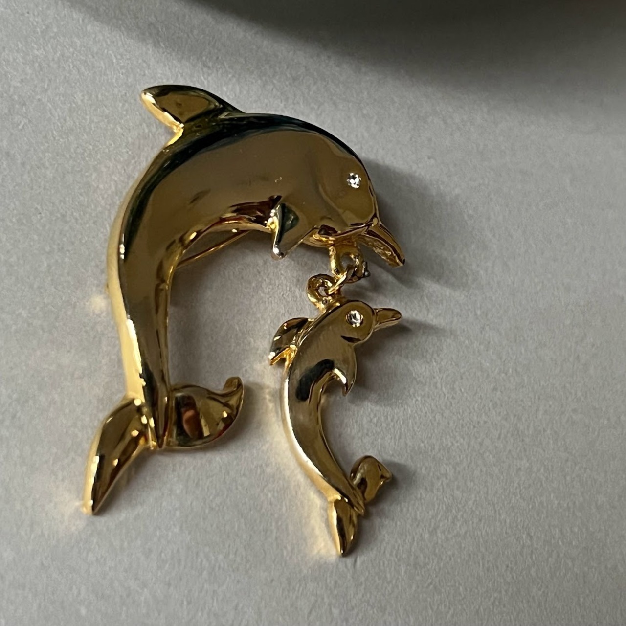 イルカの親子が揺れる、つぶらな目が輝くブローチです。