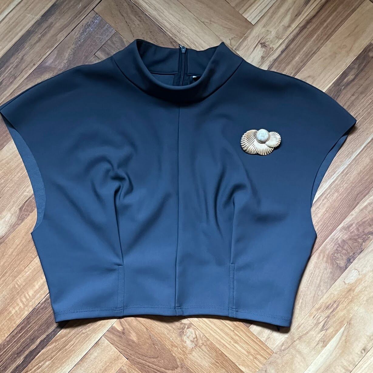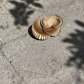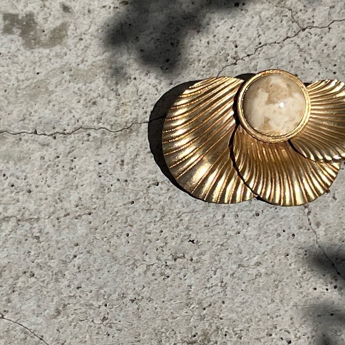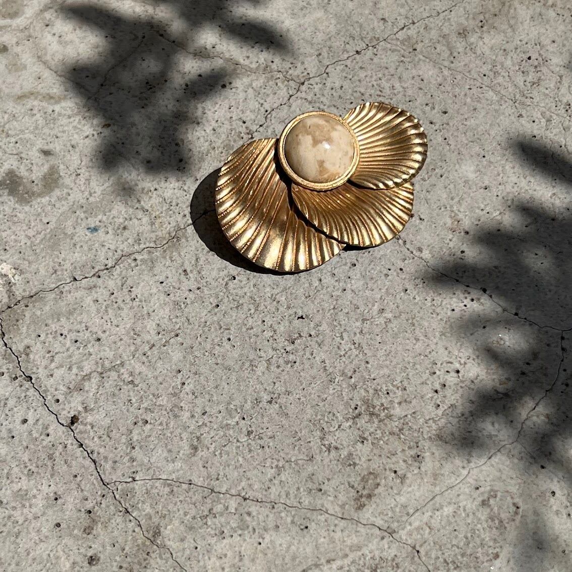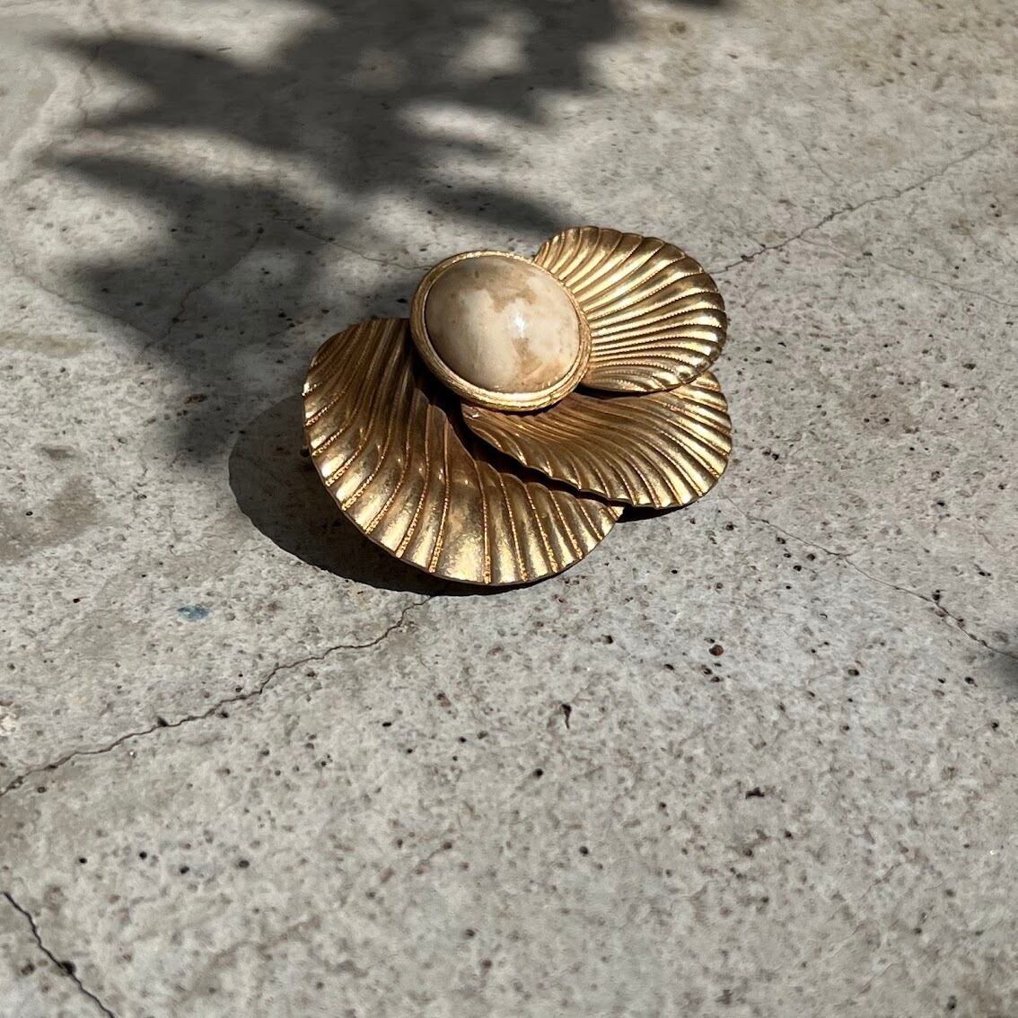 メタルの花びらが3つ重なった、立体的なデザインが素敵なブローチです。
