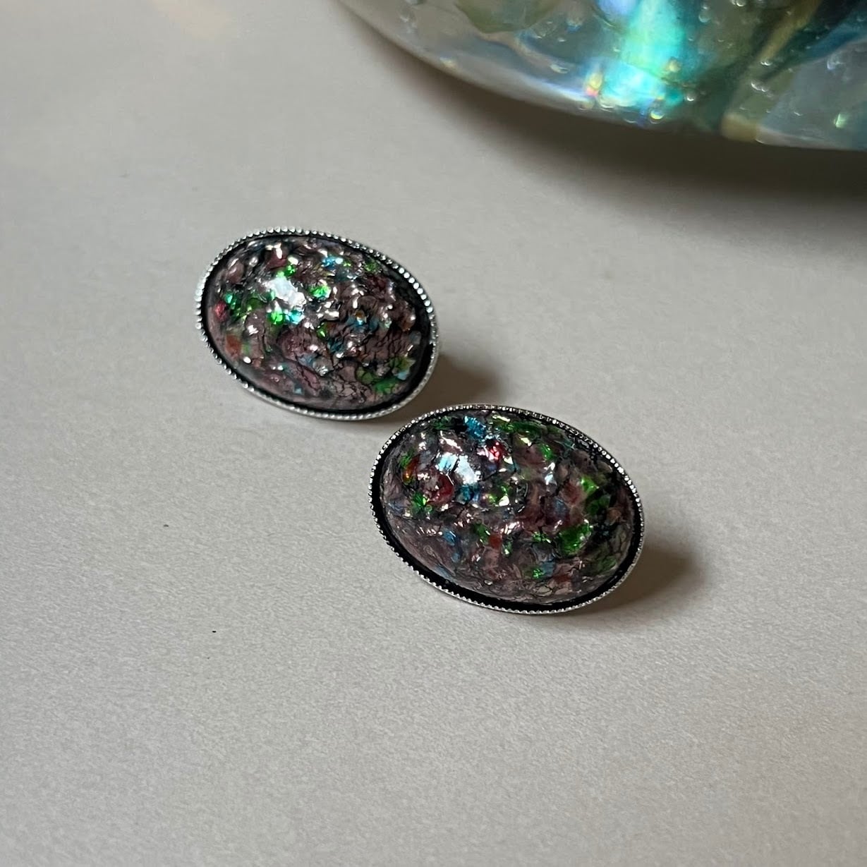 マルチカラーが鮮やかなオーバル型の素敵なイヤリングです。