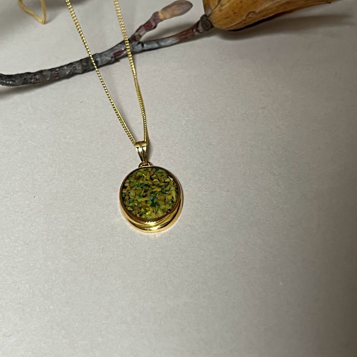 小さなオパールの薄片を集めて作っているネックレスです。光があたると上品に艶感ある輝きをはなちます。