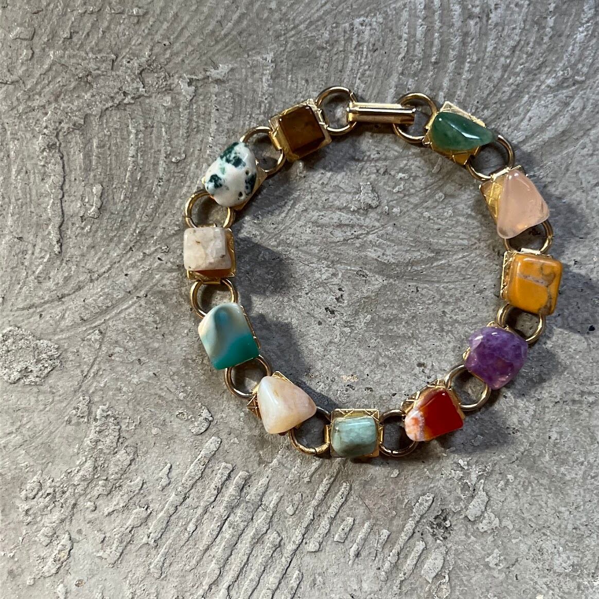 たくさんの種類の石がランダムに置かれた、華やかな印象のブレスレットです。