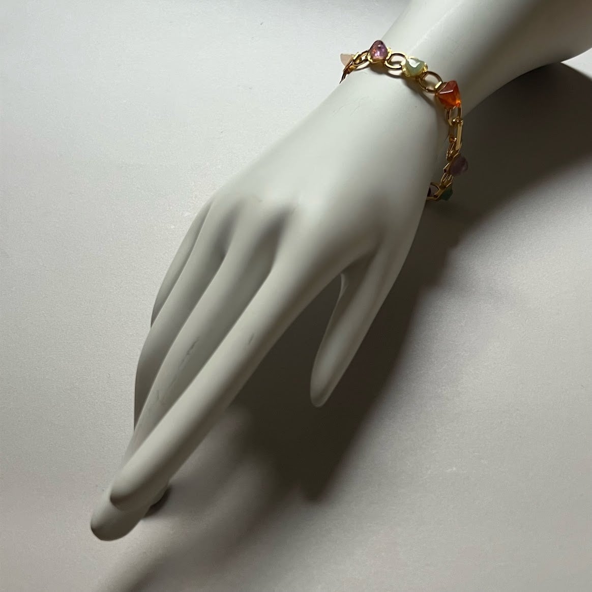 たくさんの種類の石が使われた、華やかな印象のブレスレットです。