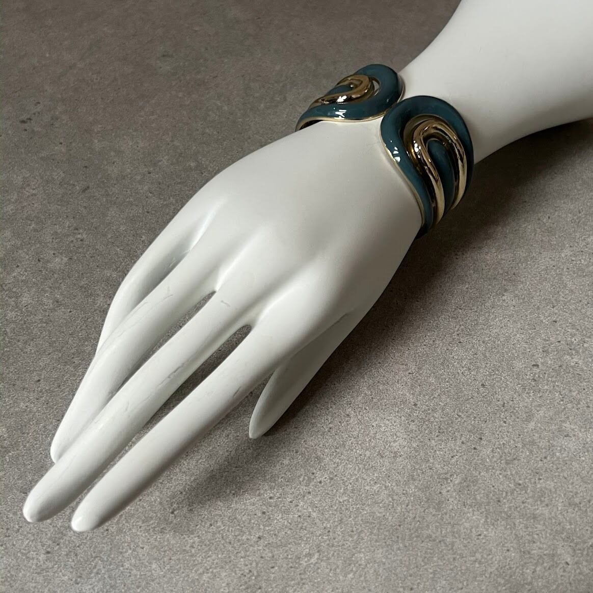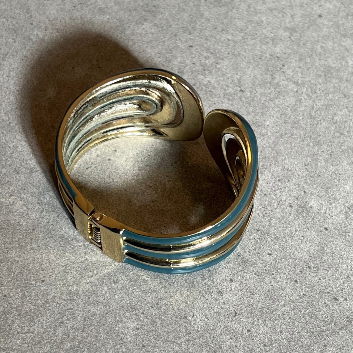 柔らかなシルエットのデザインとブルー色合いが魅力のメタルのバングルです。