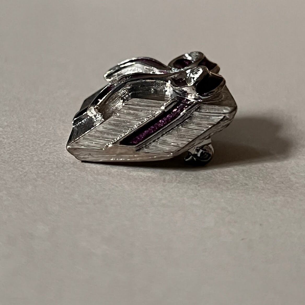 リボンがポイントの、立体に描かれたギフトボックスモチーフのブローチです。