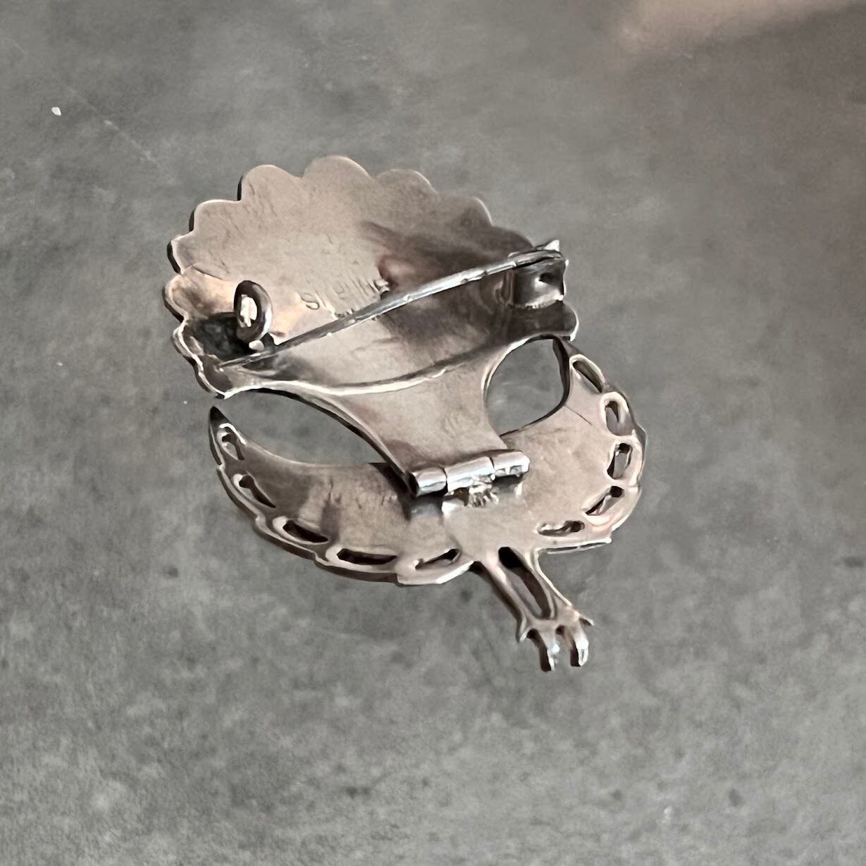 墨入りされたクジャクの柄が魅力的で、モチーフが上下に可動する仕様になっているSIAMのスターリングシルバーブローチです。