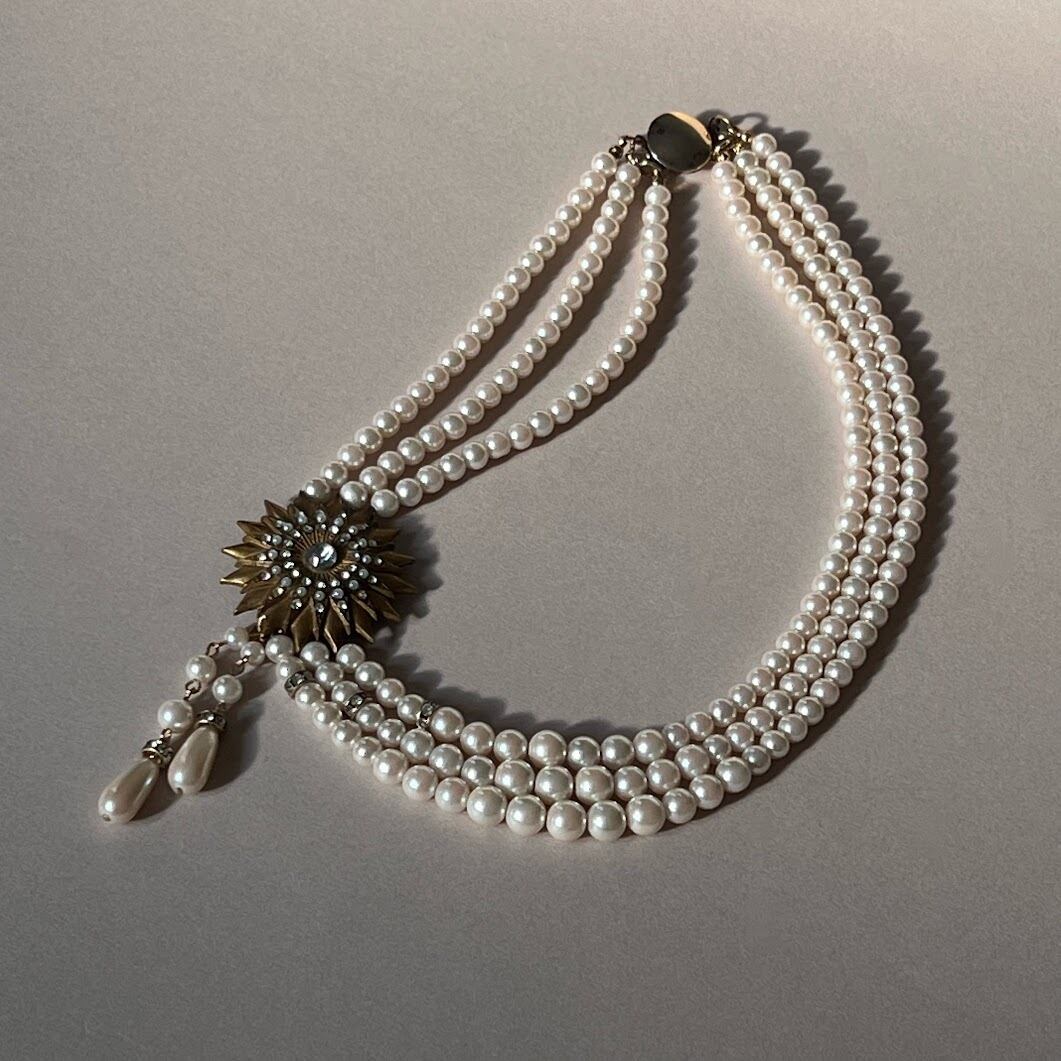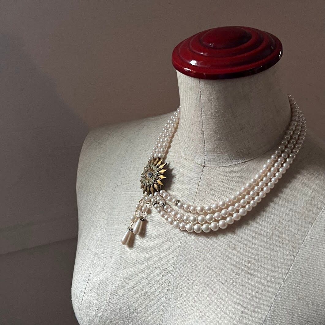華やかなメタルパーツが目を引くアンティークライクなネックレスです。