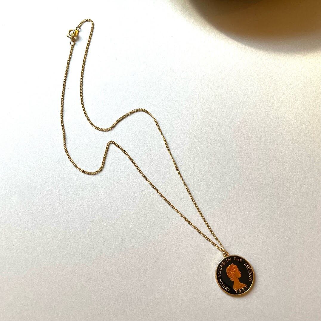 エリザベス女王が描かれたブラックトーンのネックレスです。