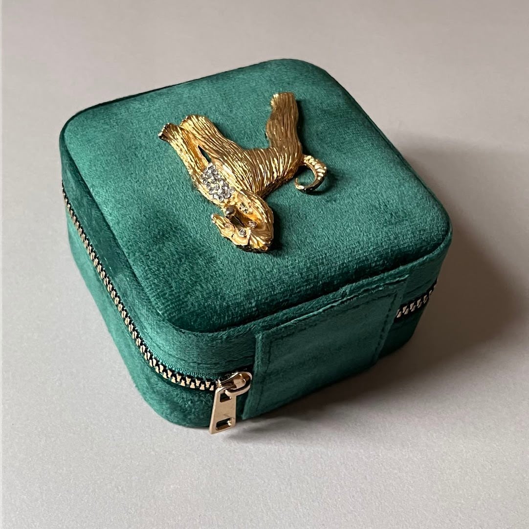 新品のジュエリーボックスに、ユーズドブローチのモチーフ部分を装飾したアップサイクルアイテム。