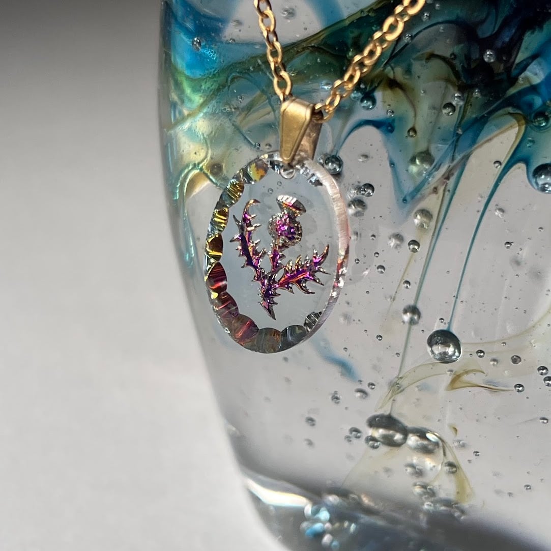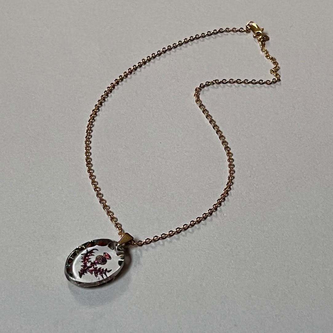 ガラスに光が入るとアザミが上品に輝く、立体感ある裏彫りのネックレスです。