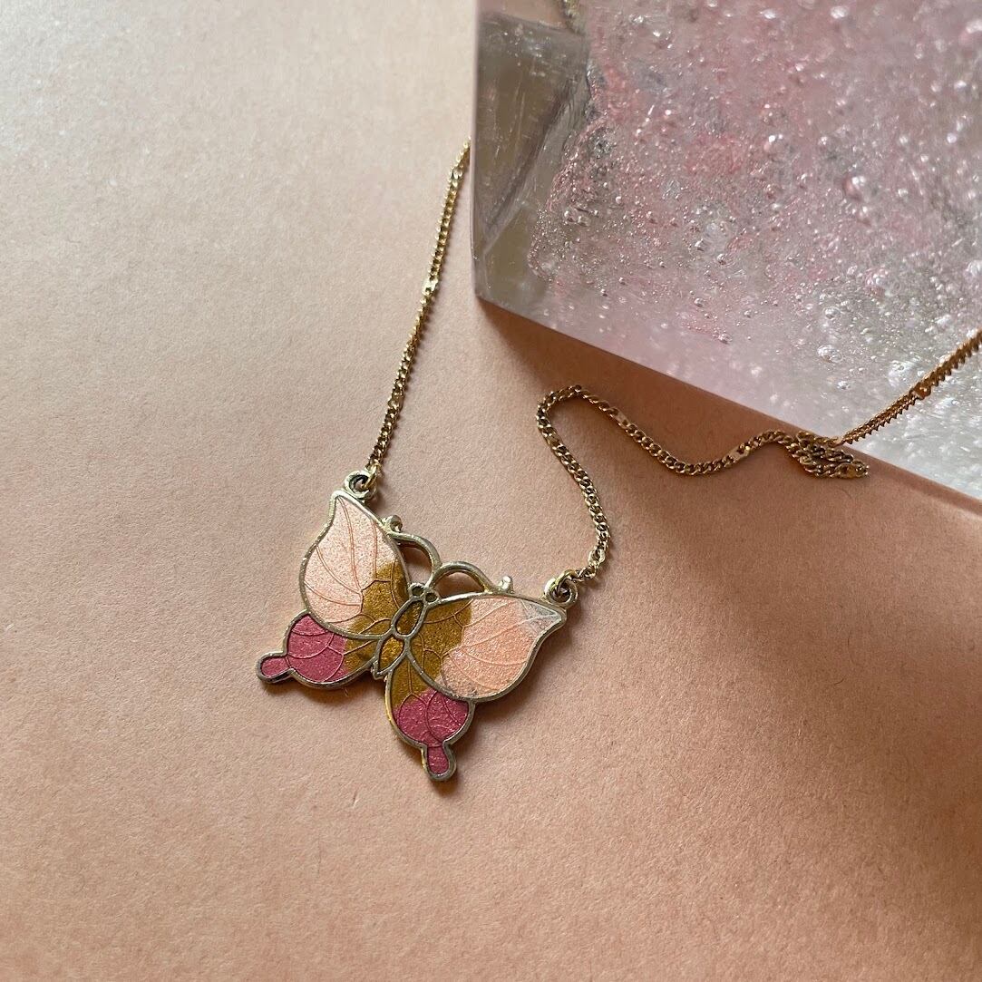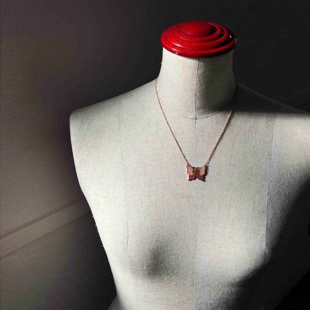 優しい色合いの蝶が魅力的な両吊りのネックレスです。