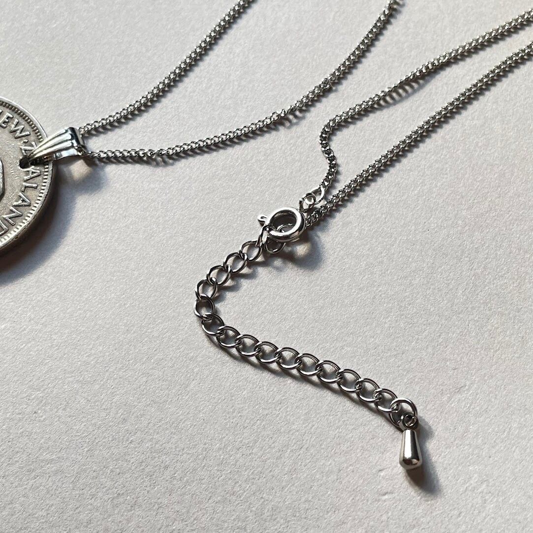 ニュージーランドで1948年に発行されたヴィンテージコインをリメイクして作られた、ハンドメイドのネックレスです。