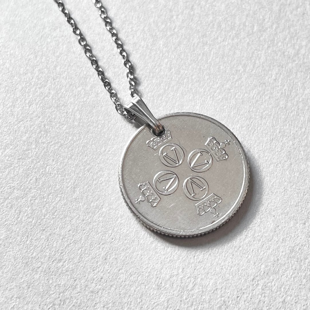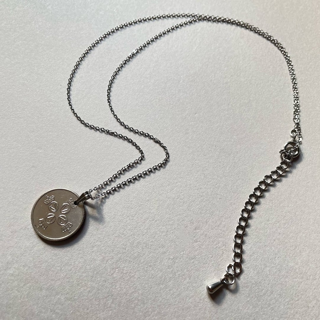 ノルウェーで1981年に発行されたヴィンテージコインをリメイクして作られた、ハンドメイドのネックレスです。
