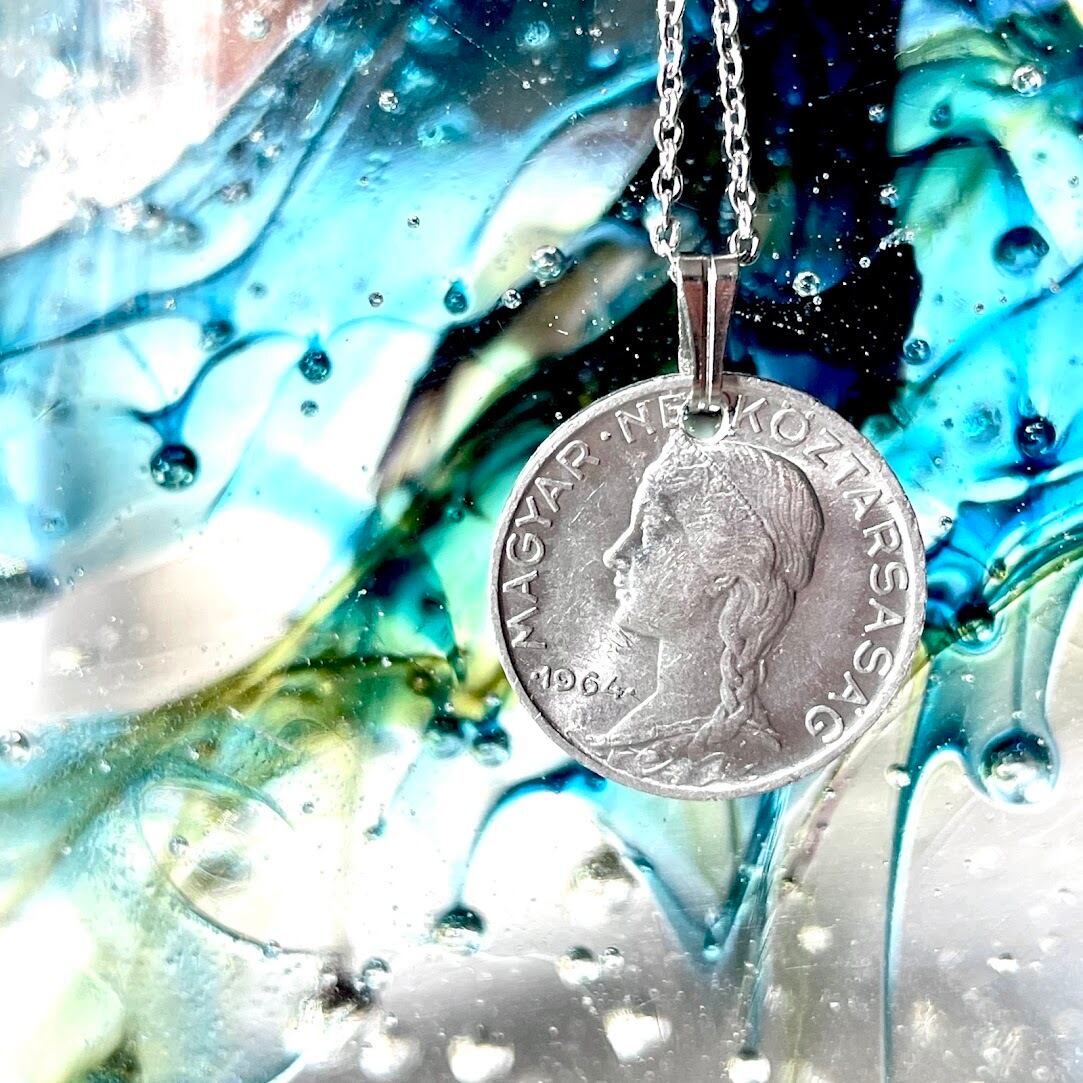 ハンガリーで1964年に発行されたヴィンテージコインをリメイクして作られた、ハンドメイドのネックレスです。