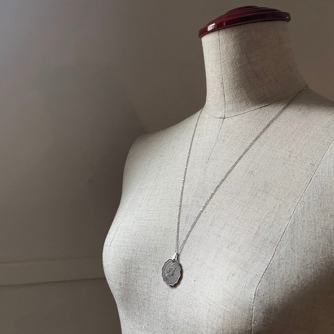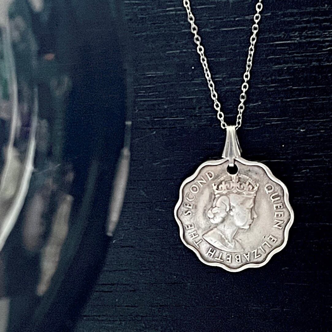 モーリシャスで1959年に発行されたヴィンテージコインをリメイクして作られた、ハンドメイドのネックレスです。