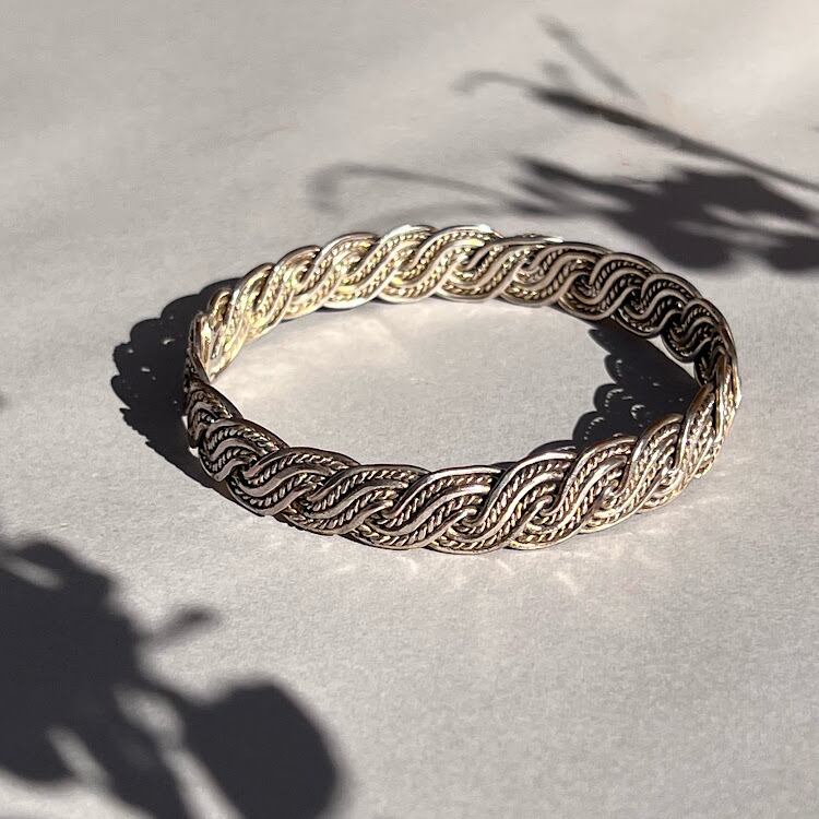 レースで編み込まれたようなデザインが素敵なバングルタイプのブレスレットです。