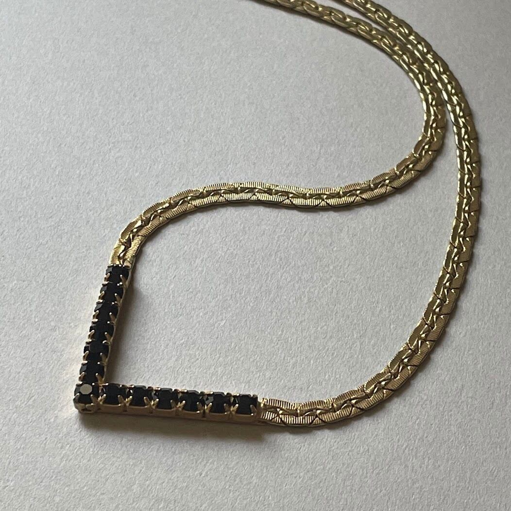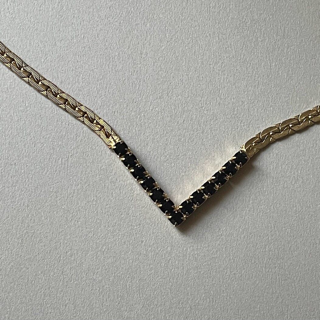 ガラスストーンが上品に反射して光るVラインのきれいなネックレスです。