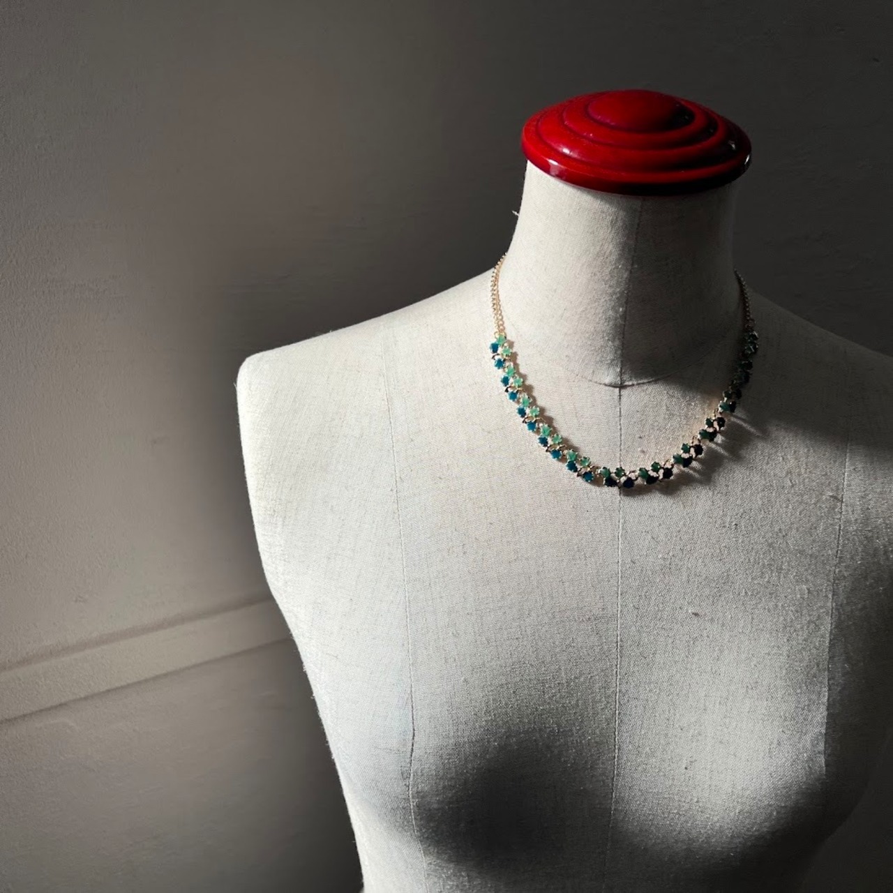きれいなグリーンカラーのリーフパーツが繋がった、立体的なネックレスです。