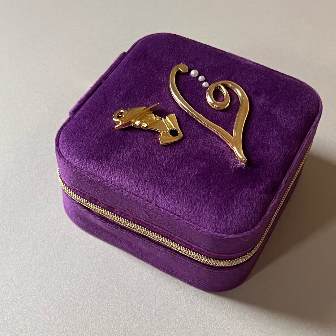 新品のジュエリーボックスに、ユーズドブローチのモチーフ部分を装飾したアップサイクルアイテム。