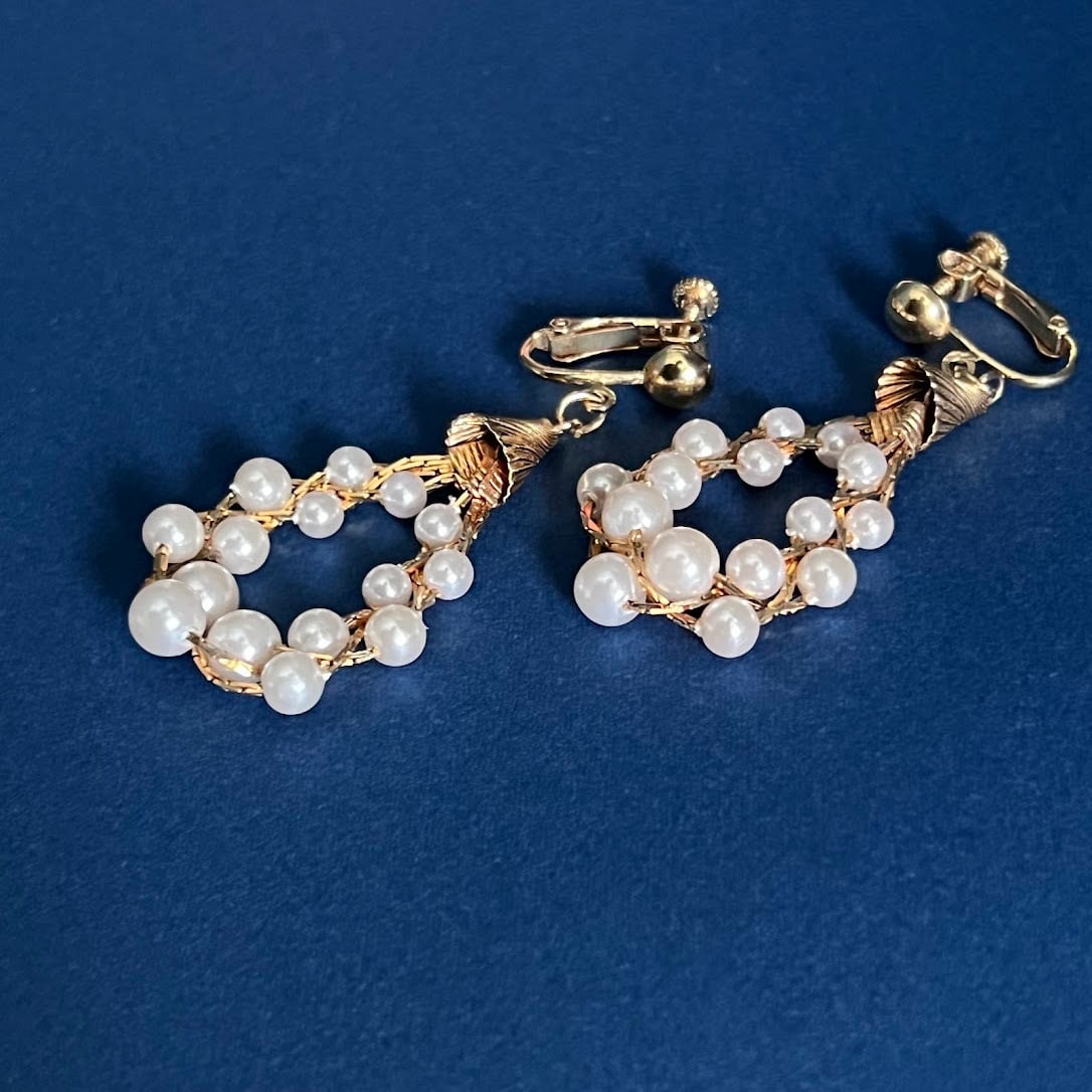 編み込んだチェーンにパールが通されたデザインが魅力のイヤリングです。