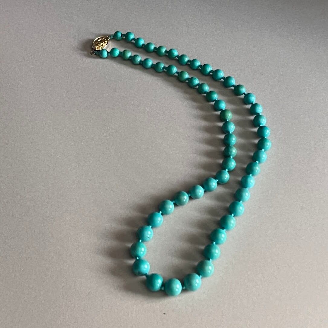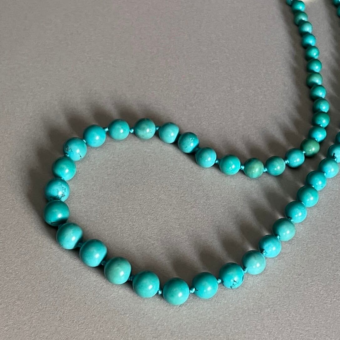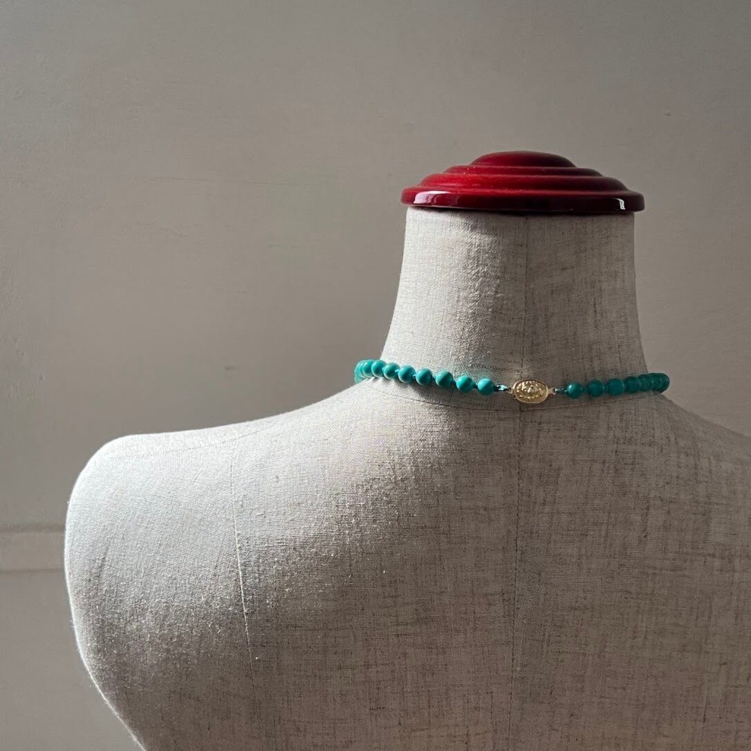 鮮やかなターコイズカラーとバックスタイルを華やかにする、クラシックな金具のネックレスです。
