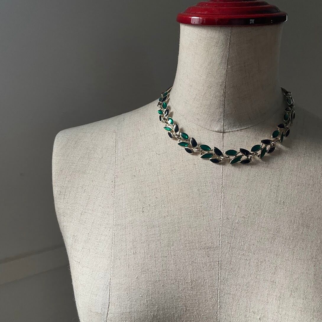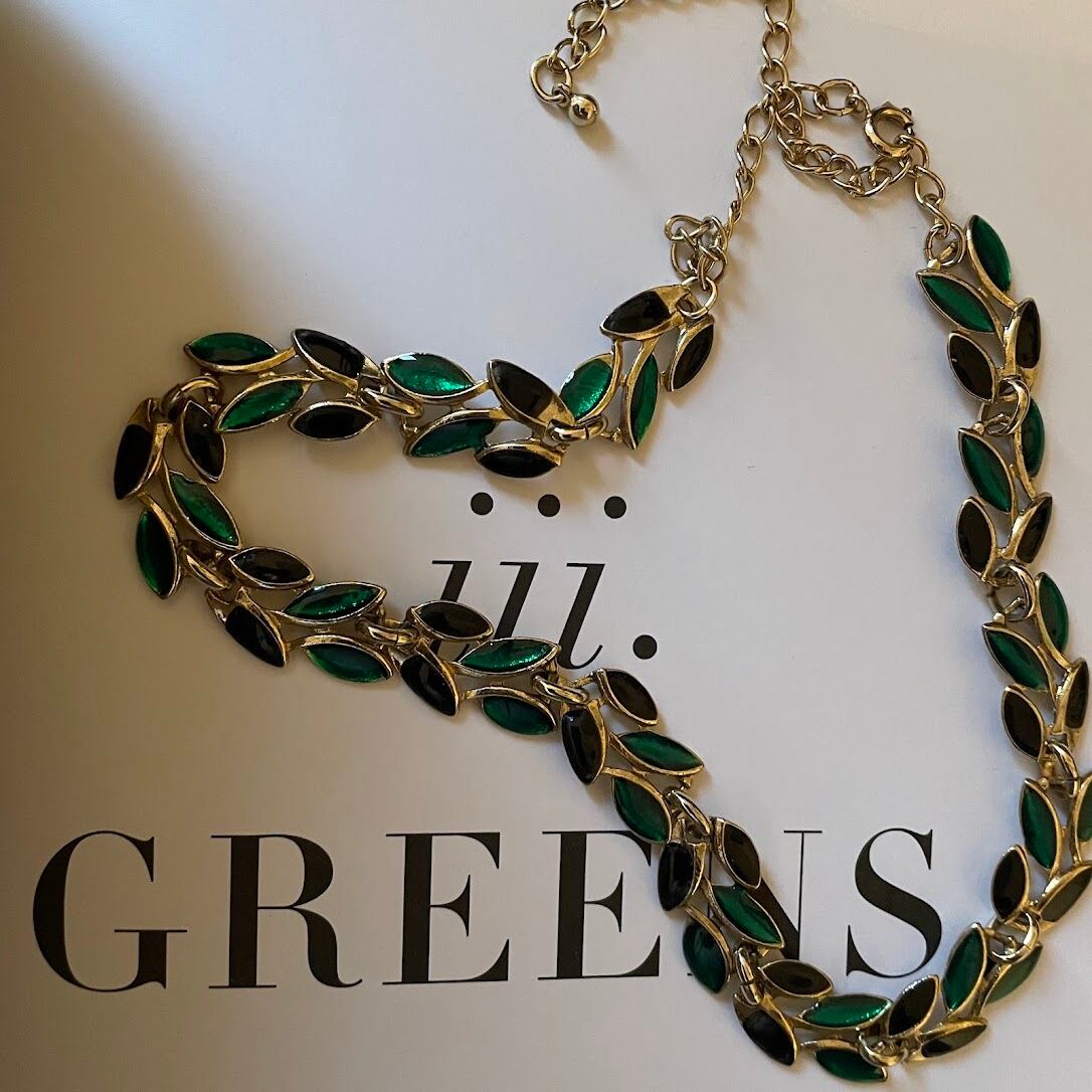 きれいな色合いのグリーンとブラックのリーフパーツが繋がったネックレスです。