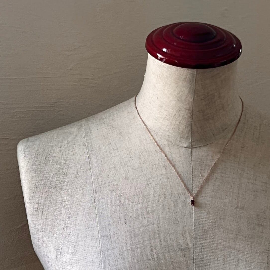 カットが入った小ぶりなガーネットが上品に輝く、シルバー925のピンクゴールドメッキ仕上げのネックレスです。