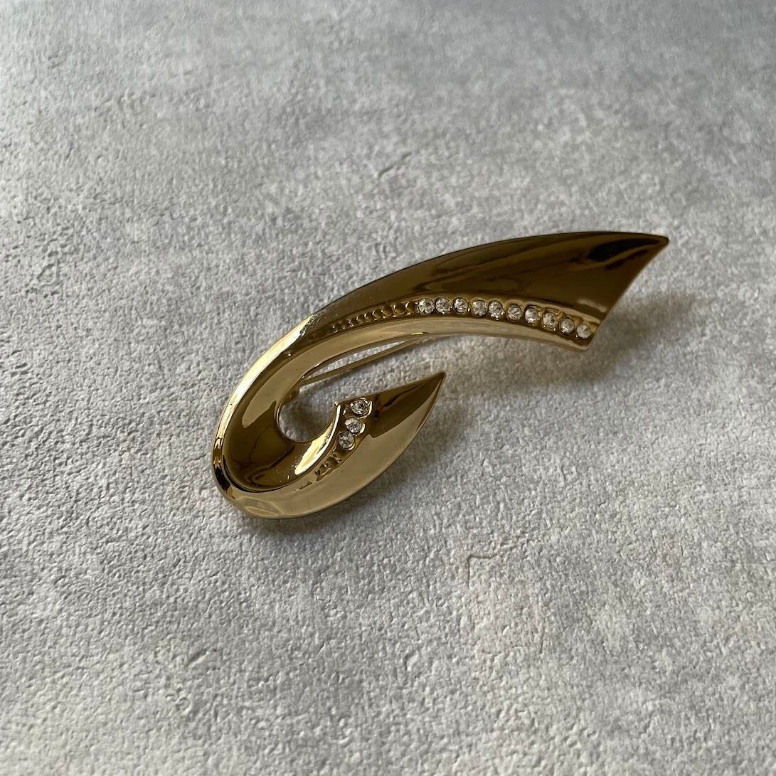 動きがあるシルエットにさりげなく輝くガラスが魅力のブローチです。