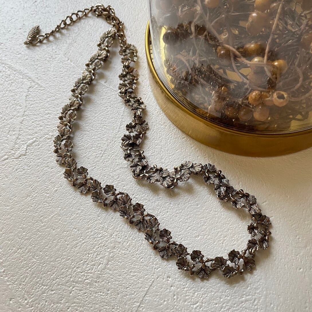 細かな柄も表現されたリーフのパーツが繋がった、立体的で上品なメタルのネックレスです。