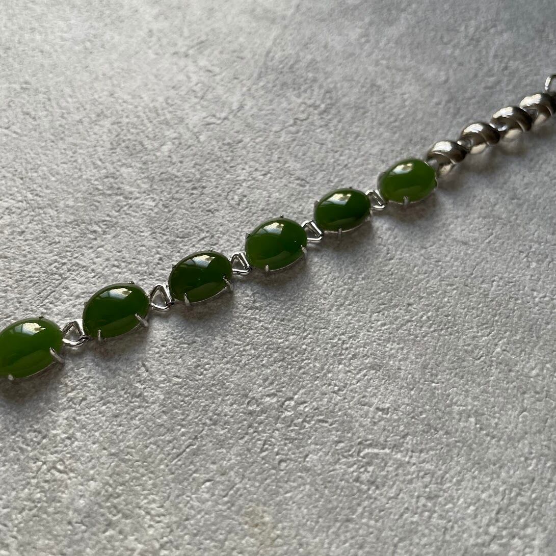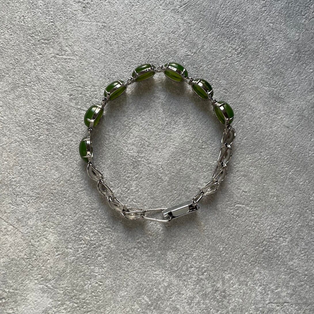 グリーンの色合いと、凝った作りの繋ぎのパーツがヴィンテージ感あるブレスレットです。